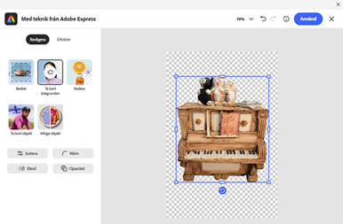 Redigera med Adobe Express ger InDesign möjligheten att redigera bilder med hjälp av ett gränssnitt lånat från webbappen Adobe Express. I denna funktion kan vi frilägga, ta bort detaljer, göra förändringar av färger och ljus samt lägga till bildeffekter. Eftersom InDesign aldrig har haft någon liknande funktion är det svår att utvärdera denna nyhet. Den som tidigare använt Photoshop för att redigera bilder till InDesign kommer antagligen att vilja fortsätta så eftersom Photoshop erbjuder många fler funktioner. Men för dem som inte har abonnemang för Photoshop ger det en ny möjlighet.